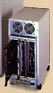 The back of the unit has a few more interesting features. For starters, you can now see how the VME bus boards stand up in the unit. Yes, they aren't all connected to the backplane in this photo. The board pulled out more than the others is the CPU board, which sits in slot #1. Also, quite a few boards have been removed. Above the VME bus boards you can see the dual fans that cool the hard-drive bays.