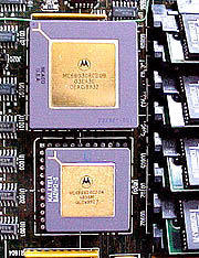 The larger of the two chips in this image is the 68030 CPU. The smaller chip that looks similar is the 68882 FPU (Floating Point Unit). Modern processors have the FPU built in, but back in the days of the 68XXX series, the FPU was an independent chip, and could even be removed! Of course, the machine would perform floating point calculations at a crawl if you removed the chip, but for most operations, performance would be unaffected.