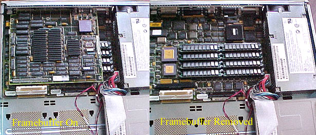 With the framebuffer removed, you can see the CPU and FPU, the RAM, and all the other components of the motherboard. This machine appears to only have 8MB of RAM.