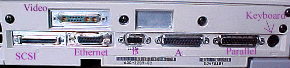 Presented in this picture is the ports on the rear of the machine. I hope you're browsing with images on, as I've labled each port on the photo itself. However, from left to right, is the 50pin SCSI port, the 13w3 Video connection, the DB-15 AUI Ethernet (which, with a transciever, can be adapted to standard 10base-T), the "B" serial port (9pin), the "A" serial port (25pin), the DB-25 parallel port, and the mini-din keyboard port. Note that the smaller, blocked-off opening next to the 13W3 connector is, I assume, for a different framebuffer for the 3/80, which would have had a 9pin connector for the older monochrome monitors which were used on the early Suns.