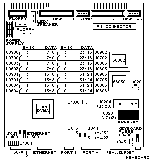 Now looking at this illustration of the motherboard, it is easier to see how the RAM banks are arranged, banks 0 - 3. Adding ram in this type of configuration means first removing ram that "lays" above it, as all the SIMMs are inserted at an angle, meaning that if you plan to upgrade your RAM, try and collect it all at once since you're going to be pulling and re-instering SIMMs for about a half hour.