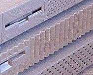 Next to the harddrives is the ubiquitous floppy drive. Which is, incedentally, one way of immediately determining a Sparc10 from a Sparc2 at a distance -- look at the side. In this image, shot from the floppy side of the machines, you'll see the Sparc2 at the top again, and you'll see the familiar round venting holes for the machine to "breathe" by pulling in air from the sides and pushing it out the back from the fan in the rear. Now look down at the Sparc10 in the center, and you'll see that Sun fashioned a wavy-side to the SS10. This "wave" is actually a series of slotted vents.