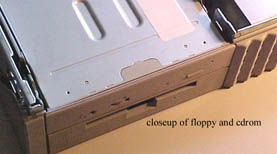 On the left side of the machine is room for two, 1-inch-high SCA SCSI Harddrives (stacked ontop of one another), with the SCA connector providing power, SCSIbus, and setting the SCSI ID. The lower of the two SCA connectors automatically sets the ID to #3, which is the factory default boot ID. The top SCA connector sets the drive to ID #1. The right side of the chassis will hold a floppy drive and optionally a CDROM drive. The initial version of this chassis required a really custom 1-inch-high CDROM drive built by Toshiba (see photo), but later versions of the chassis slimmed the floppy drive in the lower part of the bay, allowing the use of a regular height CDROM drive. Also note that some folks use the CDROM drive bay to mount additional 50pin SCSI HDs instead, but you'd better have adequate cooling if you do so!